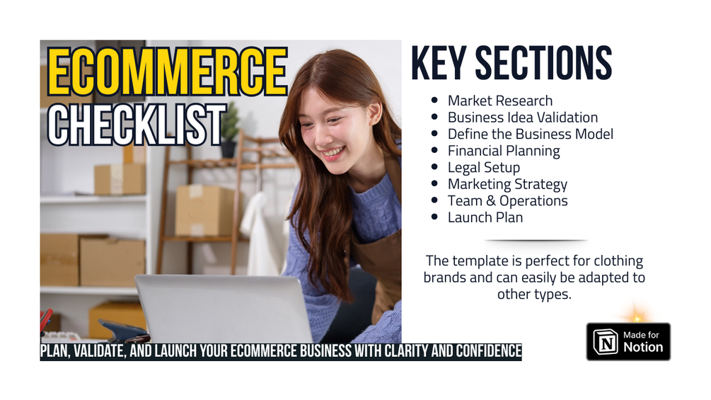 A structured Notion checklist to help you plan, validate, and launch an eCommerce business with clarity and confidence.